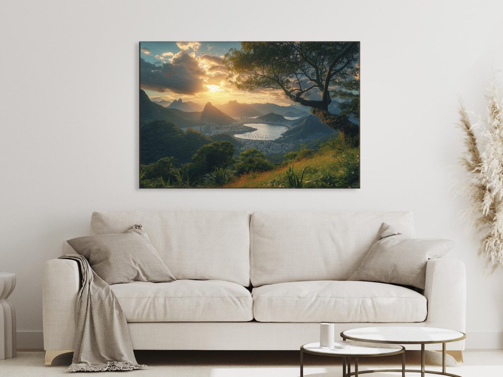 Obraz zachytáva kľukatú siluetu hôr a významné pamiatky mesta Rio de Janeiro, vrátane známeho sochárskeho diela Krista Vykupiteľa, v pozadí pri zapadajúcom slnku. Mesto je v objatí bujnej zelene a svetlo slnka preniká cez rozptýlené mraky, vytvárajúc dramatickú a teplú atmosféru. Svetlo a tieň v prírode okolo dodávajú scenérii hĺbku a kontrast.