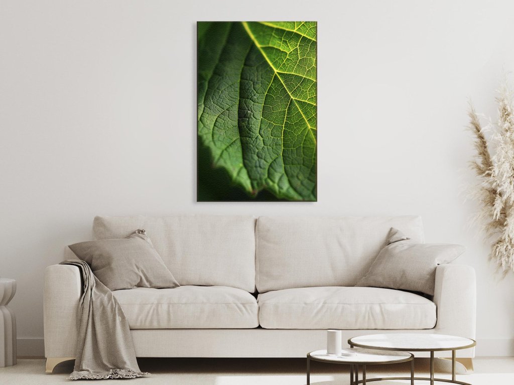 Fotografia odhaľuje zložitú sieť žiliek na liste, ktoré sa lesknú pri svetle, zvýrazňujúce vitalitu a zdravie rastliny. Hra svetla a tieňov vytvára dojem hĺbky a textúry, a zvýrazňuje každý detail. Zelené odtiene listu sú symbolom rastu a života v prírode.