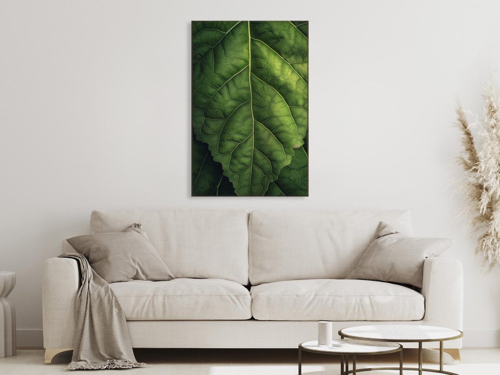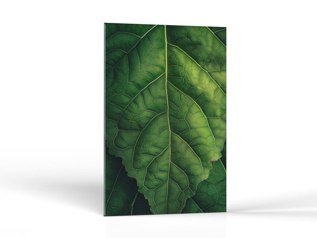 Detailný pohľad na zložitú sieť žiliek na liste, ktoré sú ako cesty rozvádzajúce živiny a vodu po celom jeho rozsahu. Textúra listu je jasne viditeľná a oživená rôznymi odtieňmi zelenej, zdôrazňujúc prírodné vzory a krásu. Drobné nedokonalosti a jemné prachové častice na povrchu listu dodávajú obrazu autentickosť.