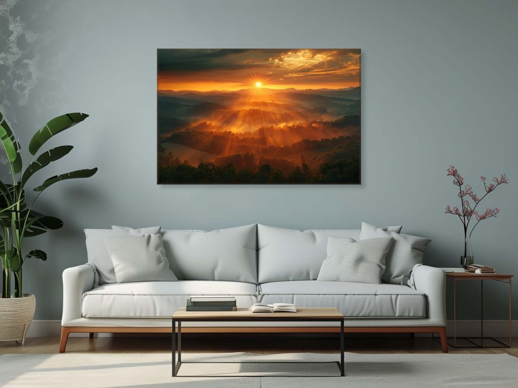 Obraz zachytáva magickú atmosféru východu slnka, ktorý lúčmi preniká cez mraky a osvetľuje zelenú krajinu. Svetlo sa odráža a vytvára siluety kopcov na pozadí. Hmla sa pomaly vznáša nad údolím a dodáva scenérii tajomný nádych.