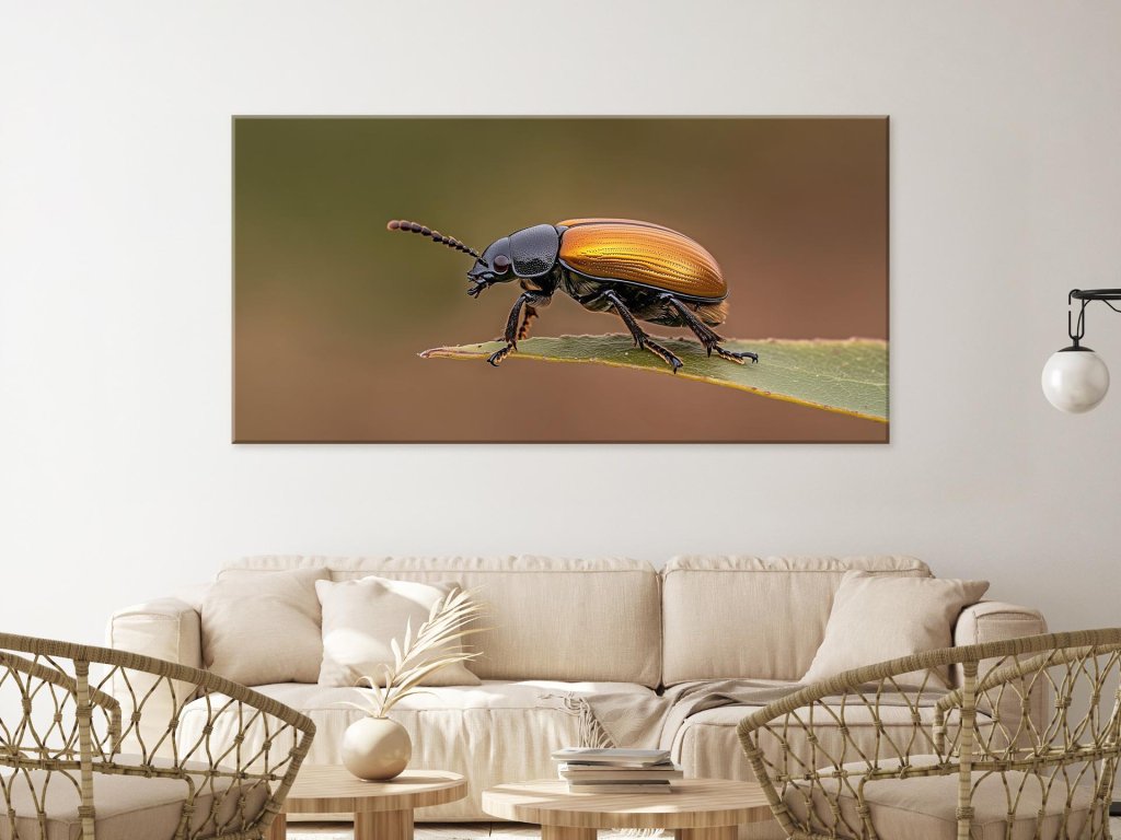 Tento obraz zobrazuje makrosnímku chrobáka s lesklým, zlatistým pancierom, ktorý kontrastuje s jemnou zelenou čepeľou listu. Jeho precízne vykreslené telo a nohy vynikajú v ostrých detailoch oproti jemne rozmazanému pozadiu. Kompozícia pôsobí esteticky vyvážene a odhaľuje fascinujúcu krásu skrytú v drobnom svete hmyzu.