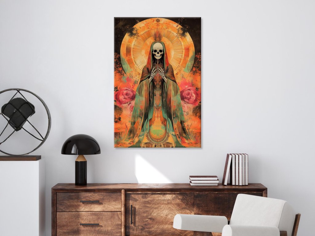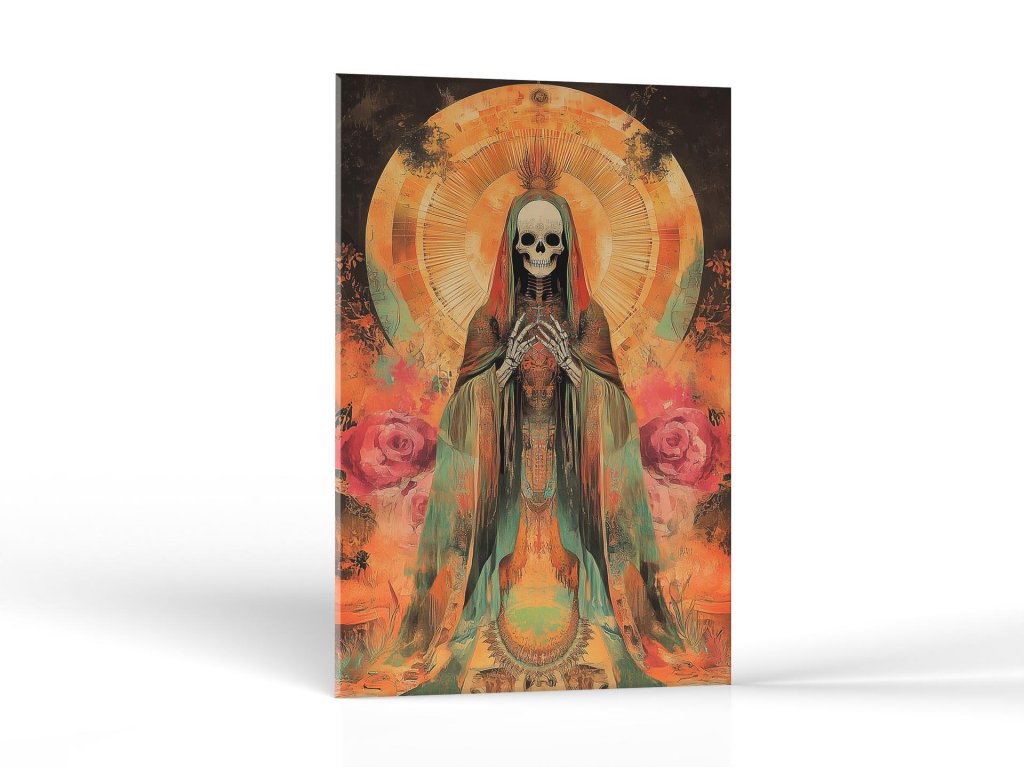 Tento obraz zobrazuje symbolickú figúru smrti s lebkou, ozdobným rúchom a výraznou zlatou svätožiarou v pozadí. Farebná paleta s výraznými oranžovými a zelenými tónmi vytvára kontrast medzi životom a zánikom, doplnená o ruže ako symboly krásy i pominuteľnosti. Celková kompozícia pôsobí ako spirituálny portrét z iného sveta, spájajúci náboženské a ezoterické motívy.