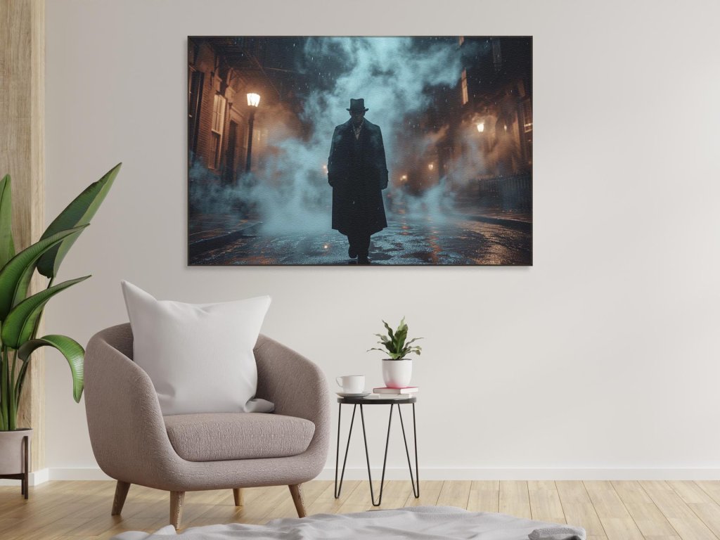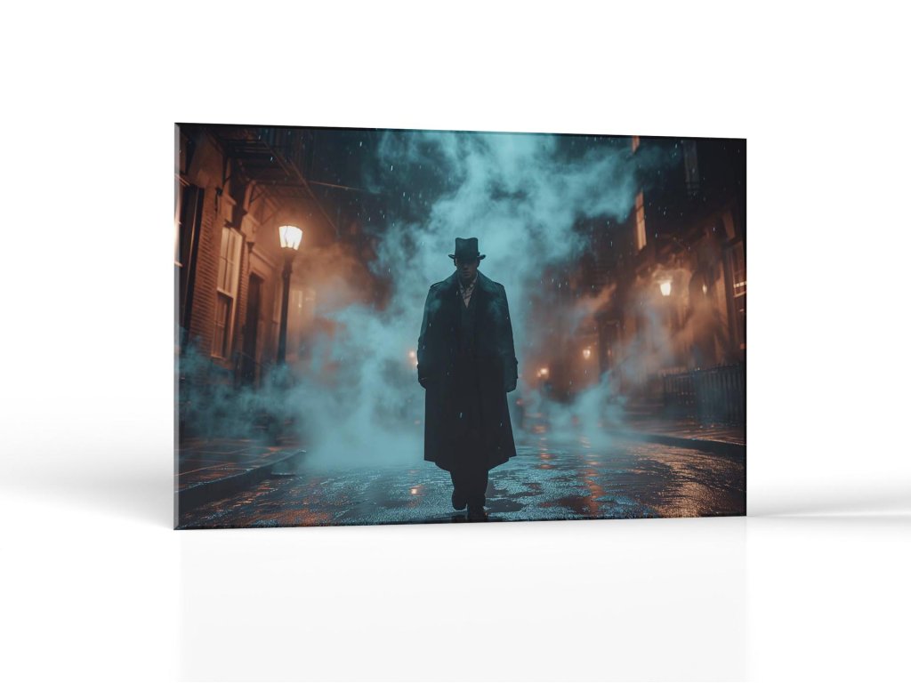Tajomný muž kráča uprostred mestskej ulice osvetlenej lampami, so zadymenou atmosférou v pozadí. Jeho postava je zahalená do tmavého kabáta, čo dodáva scéne filmový noir pocit. Ticho noci je umocnené svetlami okolitých budov a odleskmi na mokrej dlažbe.