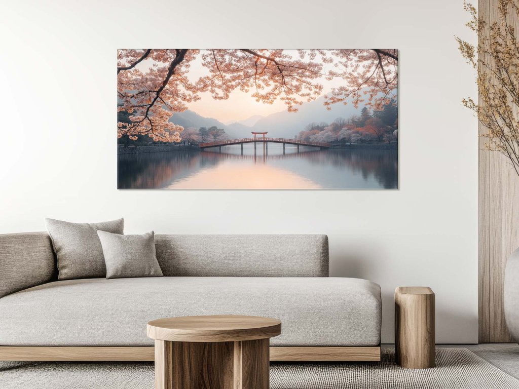Tento obraz zachytáva pokojný japonský scenár s dreveným mostom, ktorý sa tiahne ponad tiché jazero. Vetvy sakúr v plnom kvete rámujú pohľad na ikonickú bránu, ktorá symbolizuje prechod do duchovného sveta. V diaľke sa črtajú jemne zahalené hory a scenériu napĺňa atmosféra pokoja a harmónie typická pre tradičné japonské záhrady.