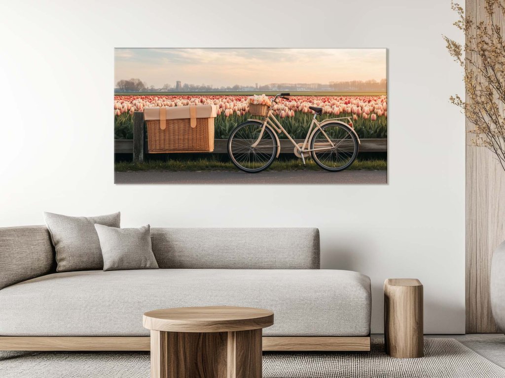 Na obrázku je zachytená pokojná jarná scenéria, kde bicykel s pleteným košíkom plným čerstvých nazbieraných kvetov stojí opretý o drevený plot. Za ním sa rozprestiera nekonečné pole tulipánov, ktoré sa ťahá až k obzoru. V diaľke sa črtá silueta starého veterného mlyna, pričom zapadajúce slnko zalieva krajinu zlatým svetlom.