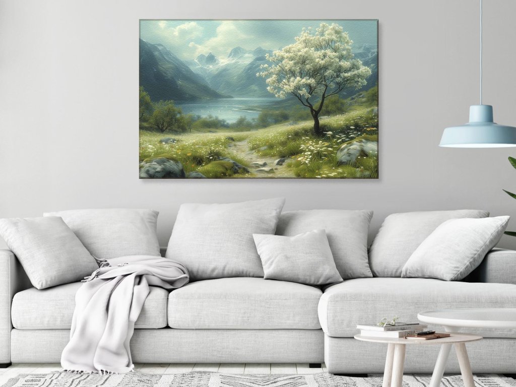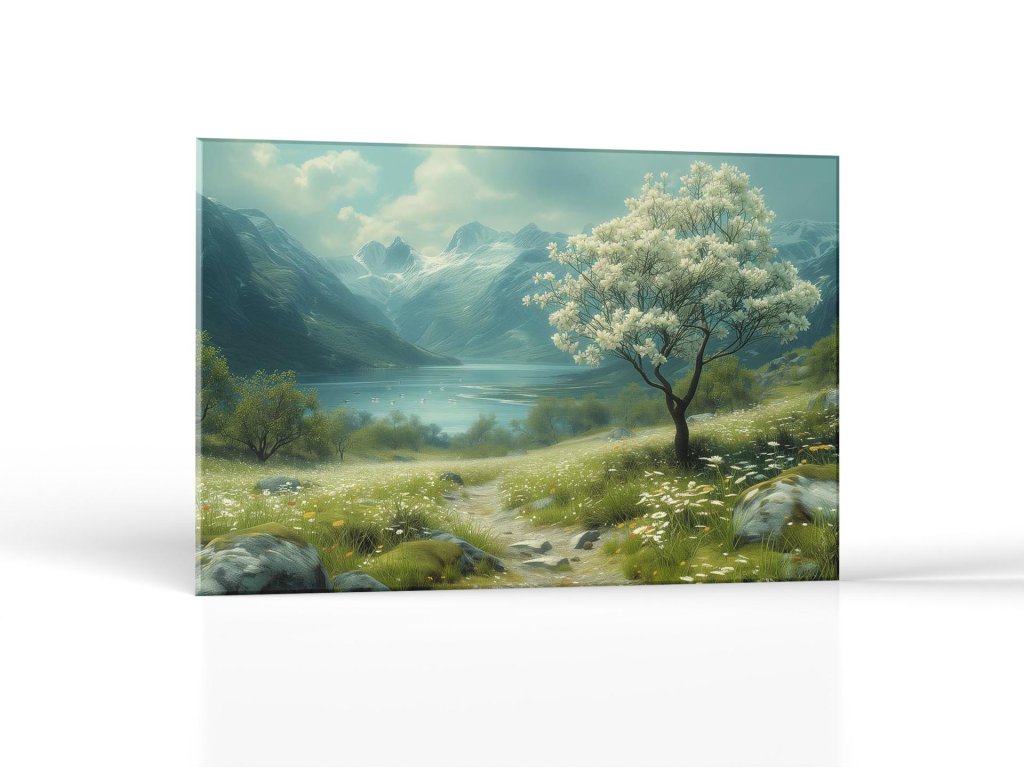 Obrázok zachytáva idylickú jarnú scénu s bielo kvitnúcim stromom v popredí, ktorý vyniká na pozadí zelenej doliny a modrého jazera. V diaľke sú viditeľné hory pokryté snehom a nebo je jasné s oblakmi, ktoré sa lesknú na slnečnom svetle. Celý obraz vyvoláva pocit pokoja a obnovy, ktorý je charakteristický pre jar.