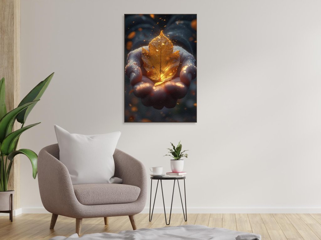 Na obraze je zobrazený jeden zlatistý jesenný list, ktorý spočíva na otvorených dlaníach pokrytých drobnými kvapkami rosy. List je osvetlený zozadu, čo zvýrazňuje jeho žily a dodáva mu iskrivý efekt, zatiaľ čo pozadie tvorí hrejivé, nejasné svetlo, evokujúce pohodu chladnej jesennej atmosféry.