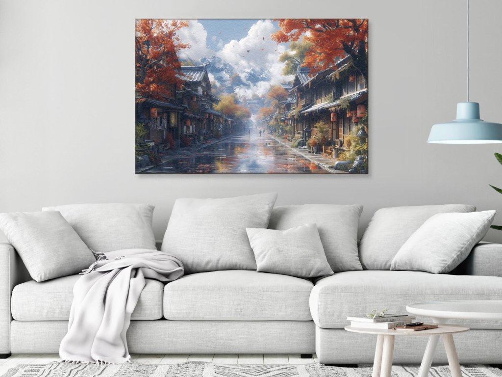 Obrázok zachytáva starobylú ulicu ozdobenú tradičnými lampami a jesenným lístím, ktoré sa mihotajú v miernom vetre. Odrazy mokrého dlažobného kameňa a čisté nebo s letiacimi lístkami dodávajú scéne živý a pokojný pocit. Na pozadí sa týčia impozantné horské štíty, ktoré dotvárajú magickú atmosféru tohto miesta.