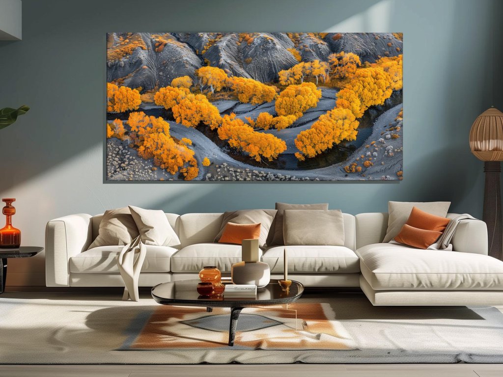 Živý obraz jesennej scény, kde oranžové listnaté stromy vynikajú na pozadí tmavošedých, zvrásnených zemských vrstiev. Stromy sú umiestnené popri vinutej rieke, čo vytvára silný vizuálny kontrast. Delikátne detaily vegetácie a terénu oživujú kompozíciu a dodávajú obrazu pocit hĺbky a textúry.