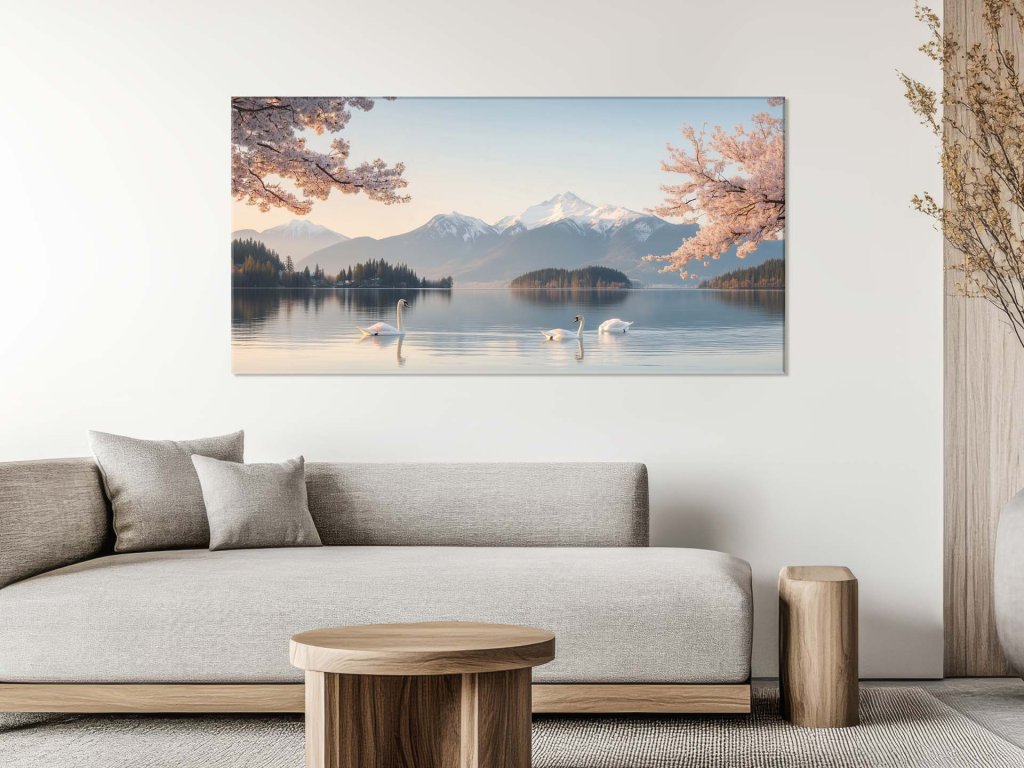 Obraz zachytáva nádhernú jarnú scenériu, kde sa ružové kvety sakúr jemne nakláňajú nad pokojnú hladinu jazera. V diaľke sa týčia mohutné zasnežené hory, ktoré vytvárajú nádherný kontrast so zeleňou borovicových lesov na ich úpätí. Tri elegantné labute sa pokojne vznášajú na vode, čím umocňujú pocit harmónie a pokoja v tomto idylickom prírodnom prostredí.