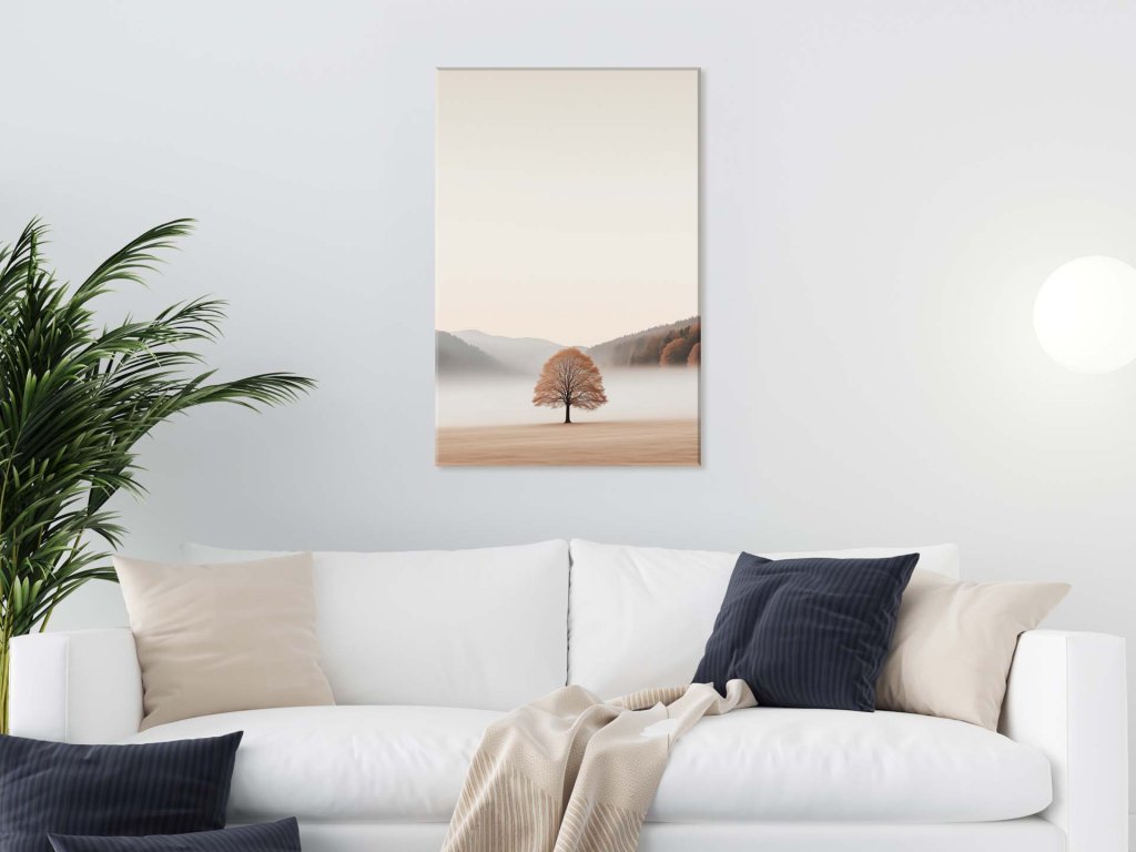 V popredí dominuje jediný strom so svetlooranžovým lístím, stojaci na otvorenej lúke zahalenej do hustej hmly. V diaľke sa dvíhajú lesnaté kopce, ktoré sa pomaly strácajú v mäkkom svetle začínajúceho dňa. Celá scéna pôsobí pokojne, čisto a vyvoláva pocit hlbokého vnútorného ticha.