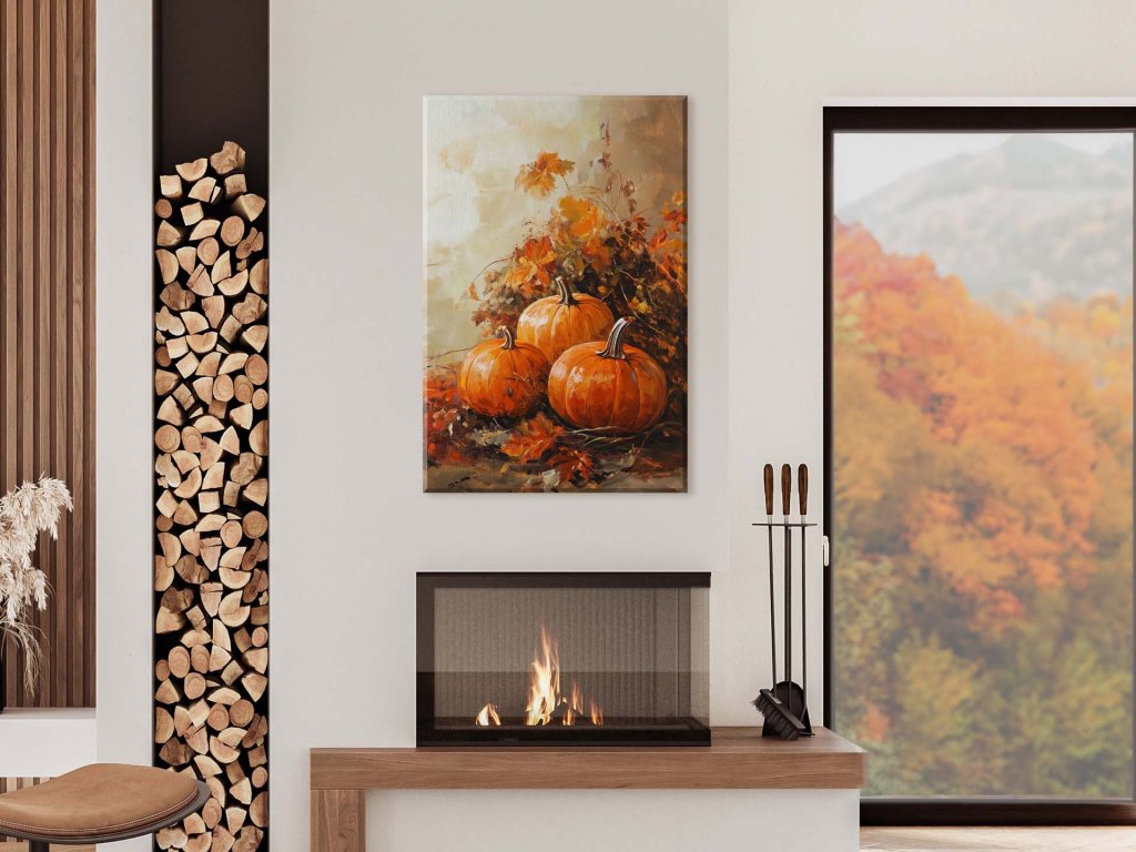 Tento obraz zachytáva atmosféru jesene, kde tri veľké oranžové tekvice odpočívajú na zemi medzi farebnými jesennými lístkami. Teplé odtiene oranžovej, hnedej a zlatej dominujú celkovému zobrazeniu a evokujú pokoj a úrodu tohto obdobia. Umelecký štýl zvýrazňuje prirodzenú krásu tekvíc a lístia, pričom vytvára jemný kontrast s neutrálnym pozadím.
