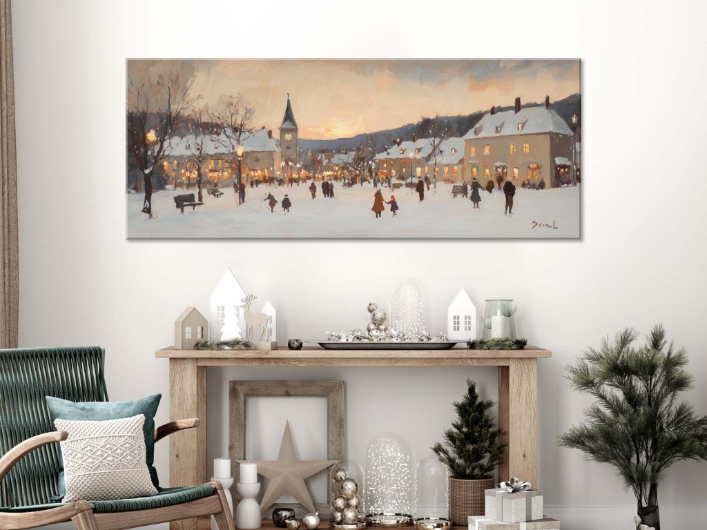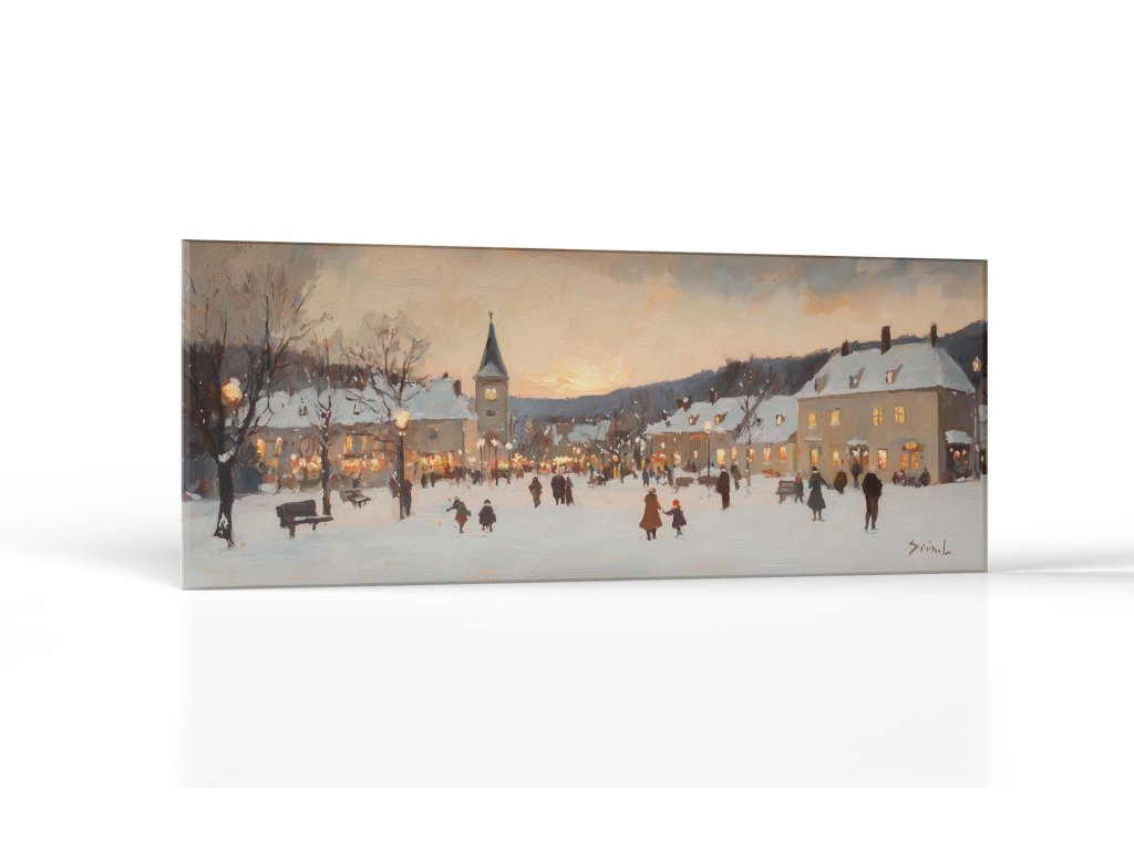 Obraz zachytáva malebné dedinské námestie pokryté snehom, osvetlené teplým svetlom lámp a západom slnka. V popredí vidieť deti a dospelých, ktorí sa prechádzajú alebo sánkujú, pričom atmosféra evokuje radostné zimné chvíle. Dominantou scény je kostolná veža, ktorá dodáva obrazu historickú a duchovnú dimenziu.