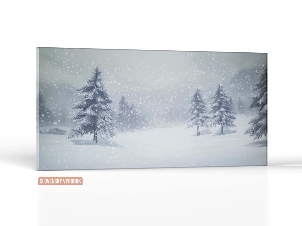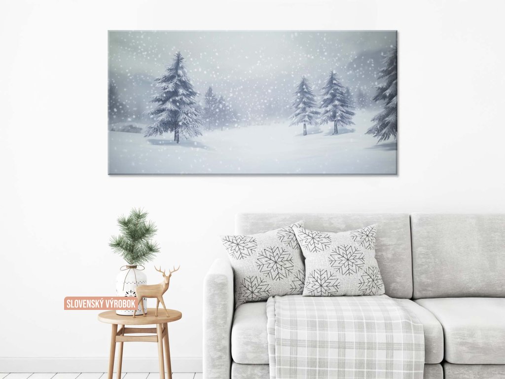 Tento obraz zachytáva tichú zimnú scenériu, kde sneh jemne pokrýva krajinu a stromčeky stoja ako strážcovia pokoja. Padajúce vločky vytvárajú atmosféru kľudu a harmónie, ktorá je typická pre hlbokú zimu. Ide o dielo, ktoré evokuje pocit útulnosti a zimného čara, ideálne na vytvorenie relaxačnej atmosféry.
