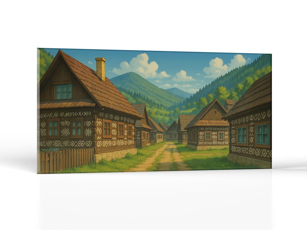 Obraz zachytáva malebnú slovenskú dedinu obklopenú hustými lesmi a kopcami pod modrou oblohou. Drevené domčeky zdobia biele ľudové ornamenty, ktoré vytvárajú harmonický kontrast s prírodným prostredím. Scéna pôsobí pokojne a nostalgicky, pripomínajúc dedičstvo a krásu tradičnej architektúry v lone prírody.