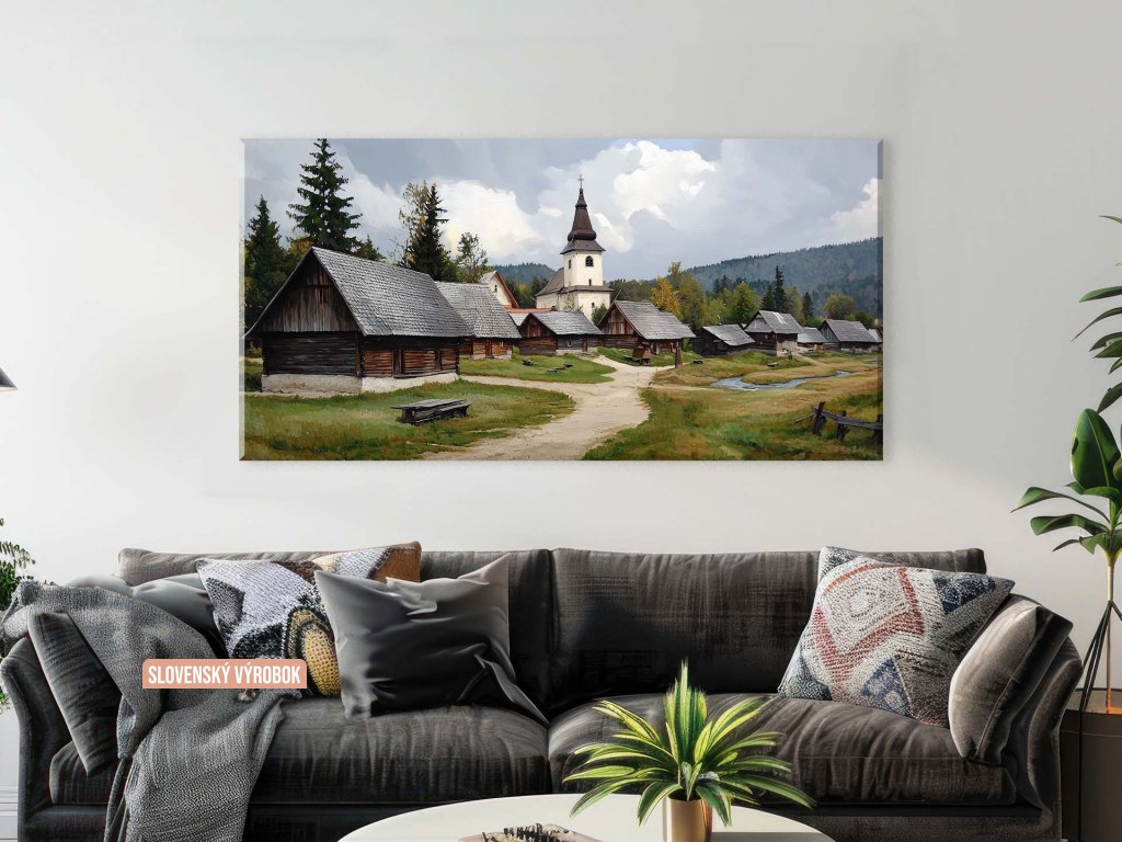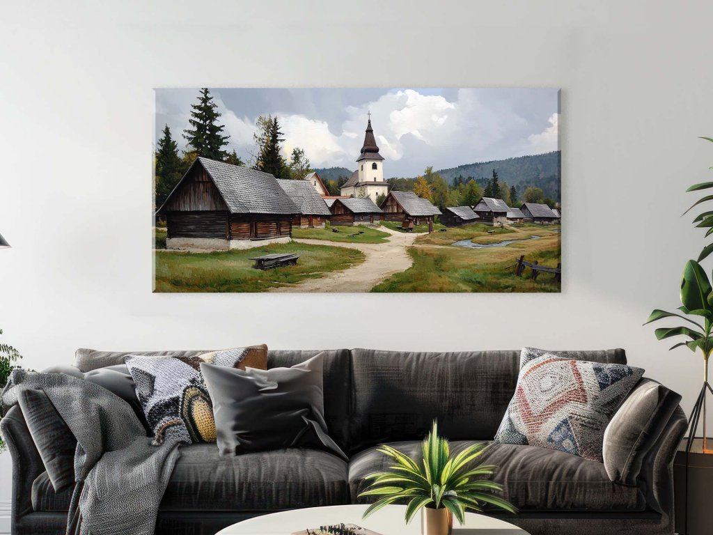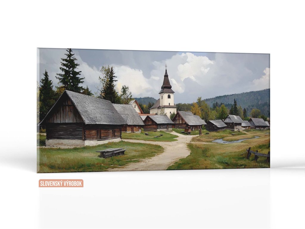 Obraz zachytáva malú dedinku, kde v strede stojí kostol s typickou vežou. Drevené chalupy s kamennými základmi a šindľovými strechami vytvárajú atmosféru pokojného vidieckeho života. Prírodné okolie, s lúkami a lesmi, dotvára harmóniu medzi architektúrou a prírodou.
