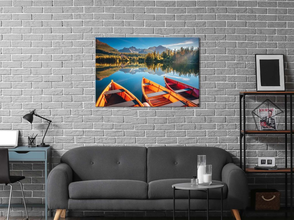 Obraz zachytáva tri drevené člny na hladine jazera Štrbské pleso, ktoré zrkadlí okolité vrchy a lesy Vysokých Tatier. Hory v pozadí sa majestátne týčia nad jazerom a sú zvýraznené jemným svetlom, ktoré dodáva scenérii pokoj a harmóniu. Krása prírody, spolu s čistou vodou a odrazmi na hladine, vytvára pocit hlbokého pokoja a spojenia s okolitou krajinou.