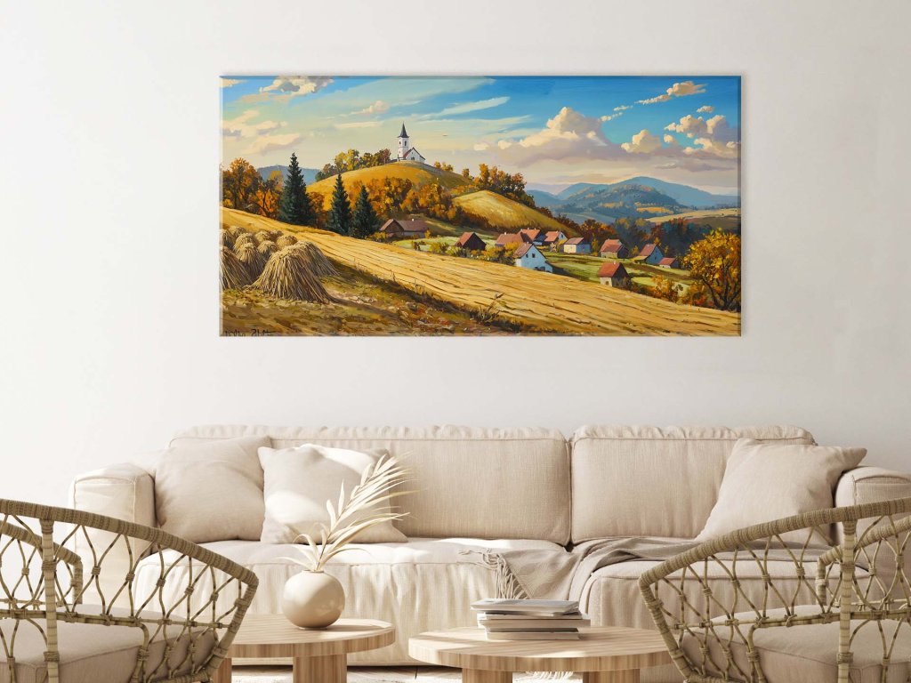 Obraz zobrazuje malebnú slovenskú krajinu, kde sa na vrchu kopca týči biely kostol s čiernou strechou. Pod kopcom je roztrúsená dedinka s domčekmi s červenými strechami, obklopená zlatými poľami a farebnými stromami. Atmosféra je jesenná, s hrejivými farbami a pokojom, ktorý prichádza s dozrievajúcim ročným obdobím.