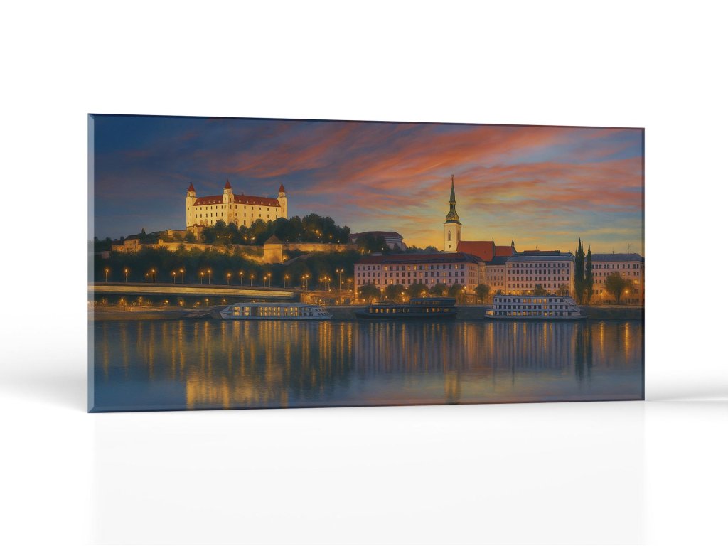Obraz zachytáva pokojnú atmosféru večernej Bratislavy, kde dominantou je osvetlený Bratislavský hrad a Dóm sv. Martina. Mesto žiari teplými svetlami, ktoré sa odrážajú na hladine rieky Dunaj spolu s tichými loďami kotviacimi pri nábreží. Farebná obloha s pastelovým západom slnka dodáva celej scéne romantický a pokojný nádych.