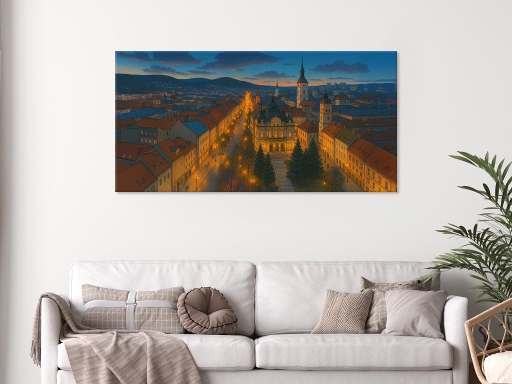 Pohľad na Hlavnú ulicu v Košiciach zachytáva čarovnú atmosféru podvečerného mesta. Pouličné lampy žiaria teplým svetlom a osvetľujú historické budovy a Dóm svätej Alžbety v pozadí. Okolie pulzuje pokojným večerným životom, zatiaľ čo obloha sa sfarbuje do tmavomodrých odtieňov.