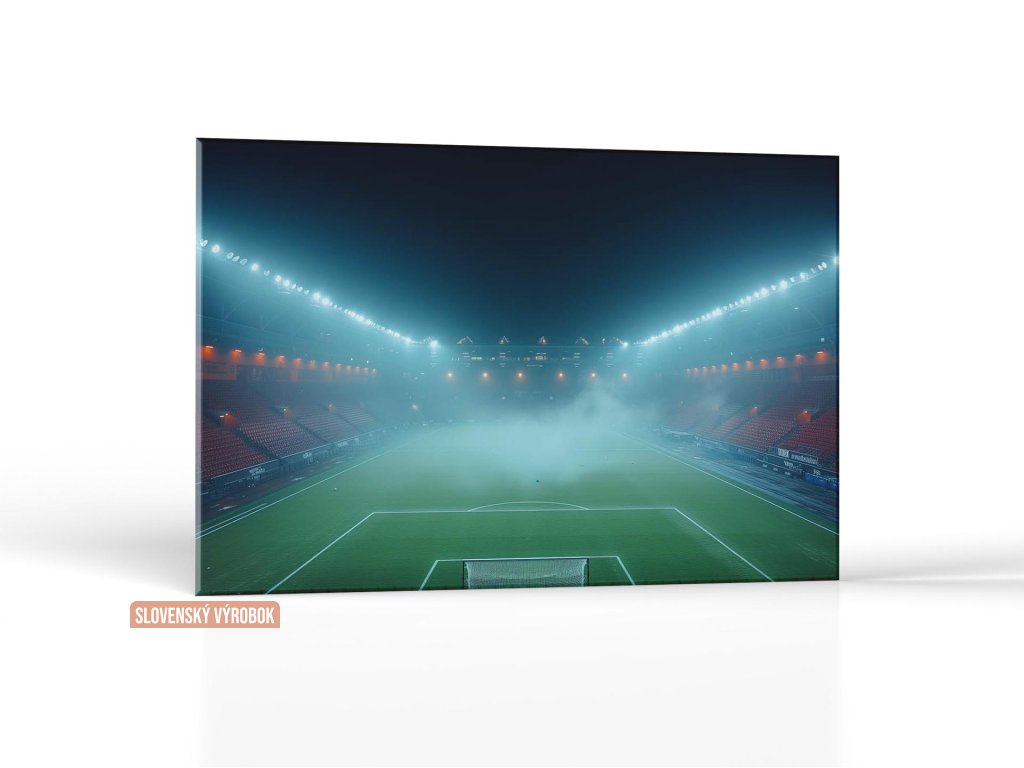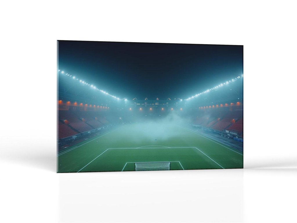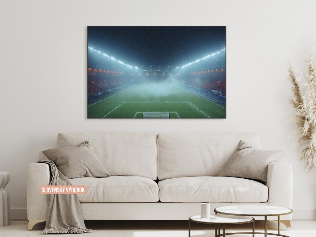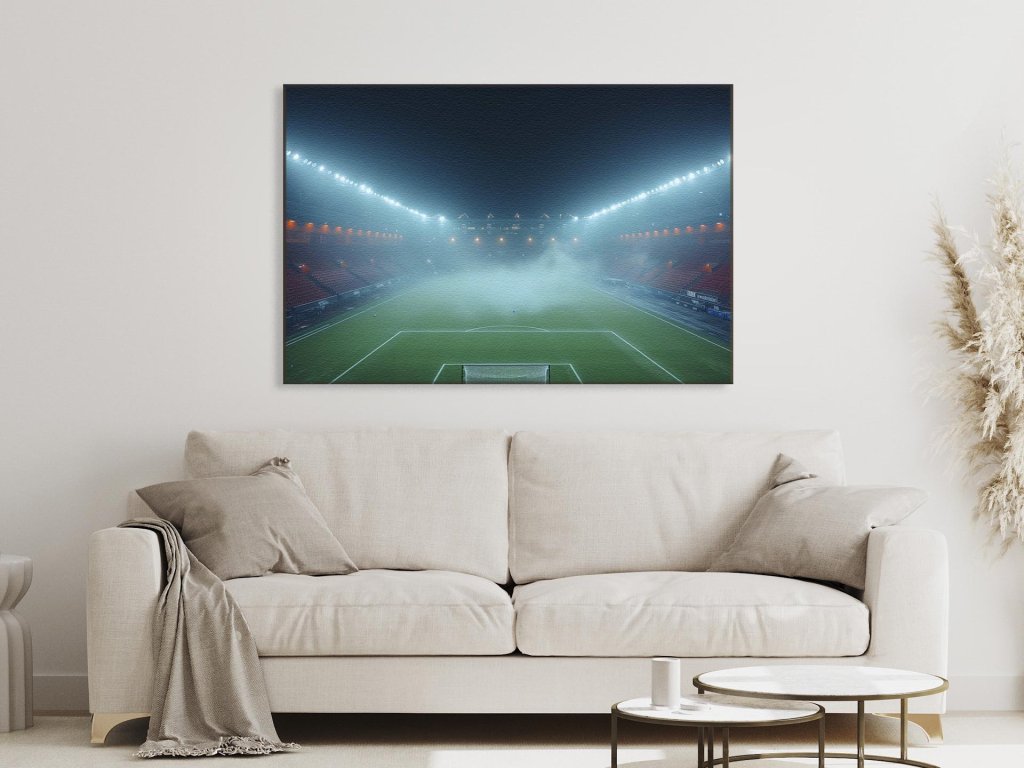 Obraz zachytáva prázdny futbalový štadión obklopený záhadnou a tichou hmlou pod nočnou oblohou. Reflektory štadióna sú zapnuté, vytvárajúce dramatickú scénu s jasnými svetelnými lúčmi, ktoré prelamujú hmlu a osvetľujú žiarivú zelenú trávu. Hoci štadión je prázdny, atmosféra očakávania a napätia je hmatateľná, akoby sa diváci mali každú chvíľu vrátiť a znovu oživiť scénu radosťou a povzbudzovaním. Tento obraz je pripomienkou ticha a pokojnosti, ktoré môže nastať aj na mieste plnom života a energie.