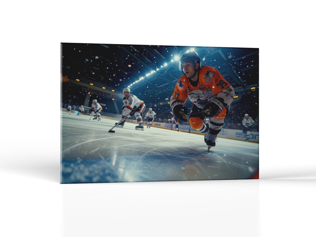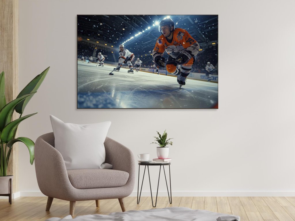 Tento obraz zachytáva energiu a rýchlosť hokejového zápasu. Hráči v oranžových a bielych dresoch sa dynamicky pohybujú po ľadovej ploche. Výrazná perspektíva obrazu a jemné odlesky svetla na ľade a ochranných sklech vnášajú do scény živost a hĺbku, divákovi umožňujú takmer cítiť chlad ľadu a vzrušenie z hry.
