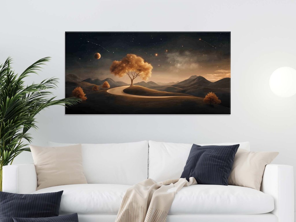 Obraz zobrazuje magickú krajinu, kde sa cesta vlní okolo žiariaceho stromu ako symbolu života a večnosti. Nad horizontom sa rozprestiera nočná obloha posiata hviezdami a vzdialenými planétami, ktoré dodávajú výjavu snový a nadpozemský charakter. Kompozícia pôsobí ako pozvanie na cestu do neznáma, kde sa stretáva krása prírody s vesmírnou tajomnosťou.