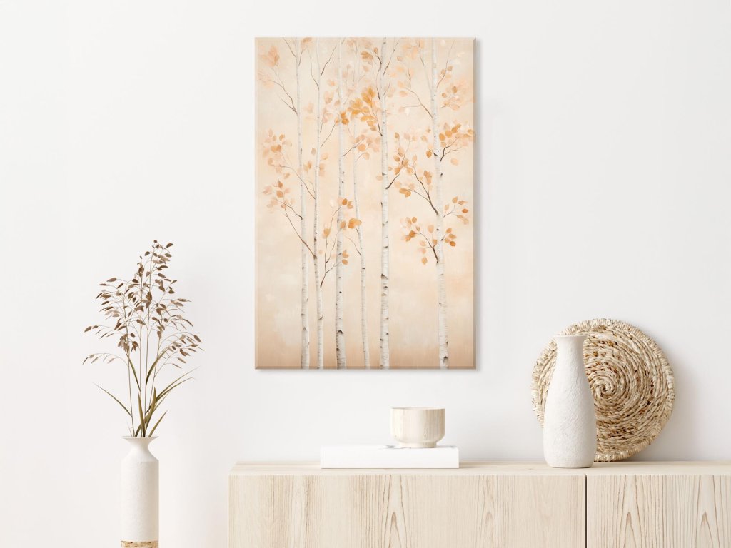 Tento obraz prináša pohľad na elegantné brezy s bielou kôrou a zlatohnedým lístím, rozložené v harmonickej vertikálnej kompozícii. Farby sú tlmené a teplé, čo vytvára dojem jesenného pokoja a mierne zahmlenej prírody. Vďaka jemnosti línií a decentnej farebnosti obraz pôsobí ľahko, pokojne a zároveň prirodzene.