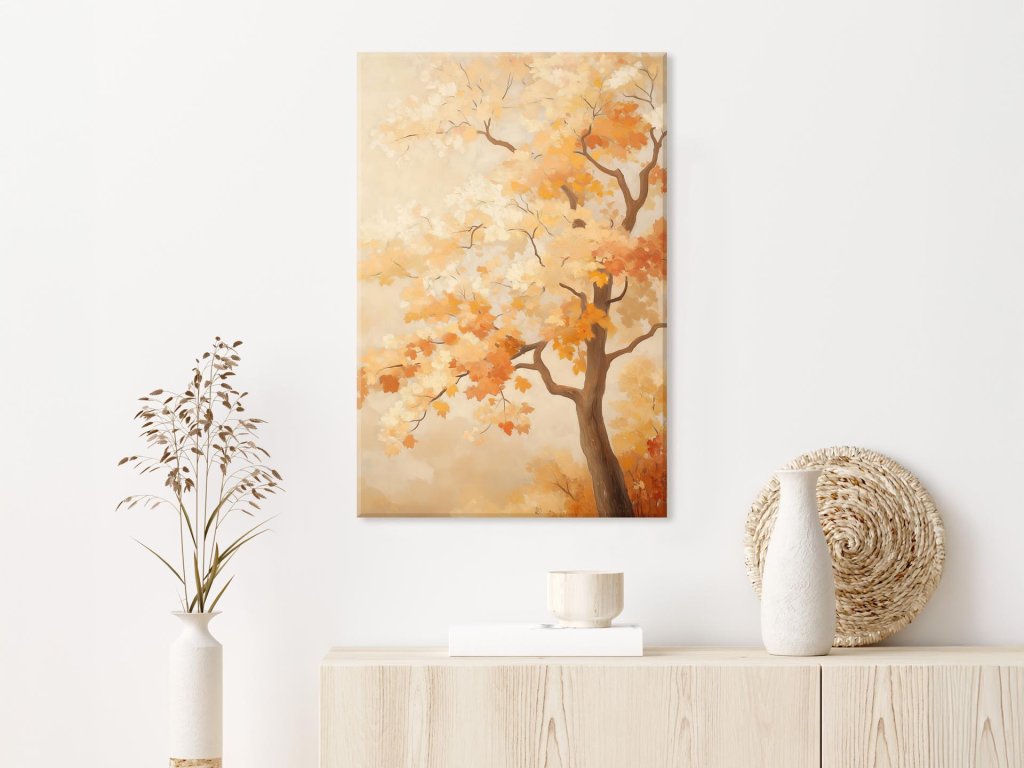 Obraz zobrazuje strom s bohato sfarbenými jesennými listami v odtieňoch oranžovej, žltej a smotanovej.