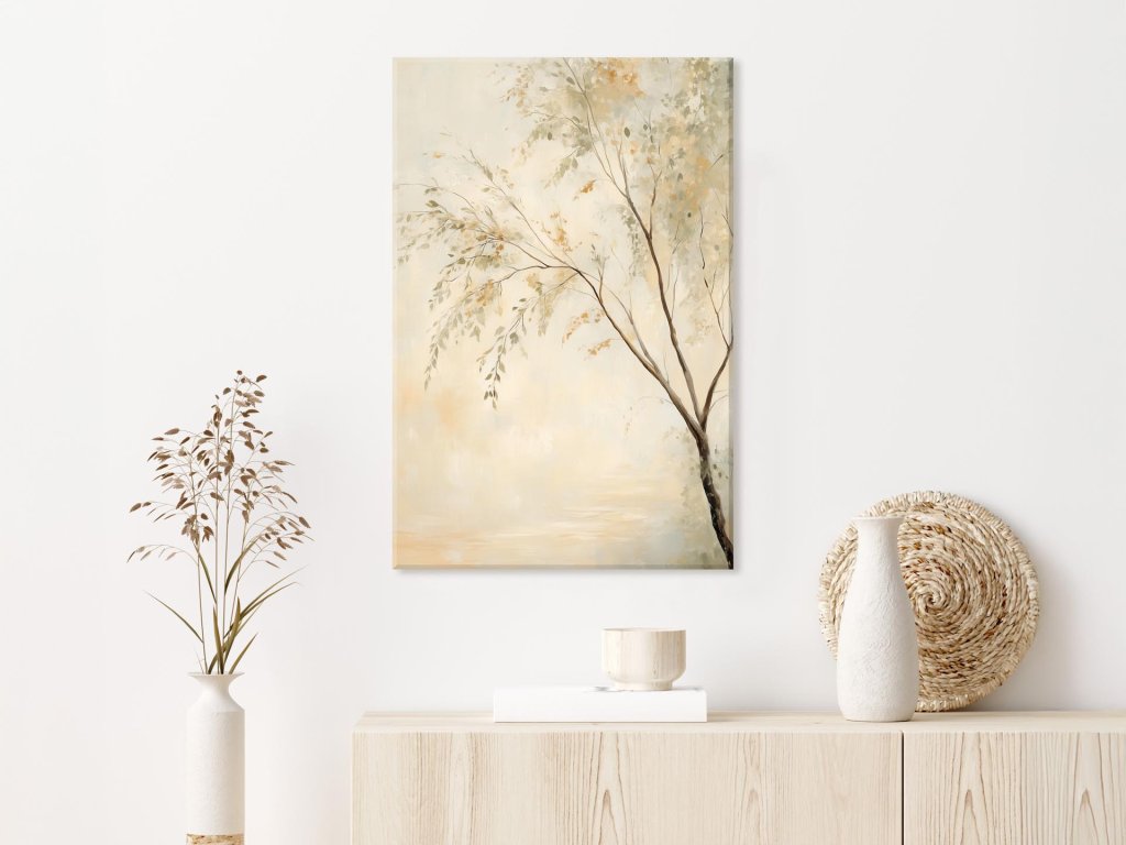 Obraz zachytáva tenký strom s dlhými, elegantne prehnutými vetvami, ktoré sa jemne skláňajú nad pokojnú vodnú hladinu. Farby sú tlmené a ladené do svetlých odtieňov béžovej, olivovej a svetlooranžovej, čo vytvára harmonickú a upokojujúcu atmosféru. Celá kompozícia pôsobí nežne a meditatívne, ako spomienka na pokojné ráno v prírode.