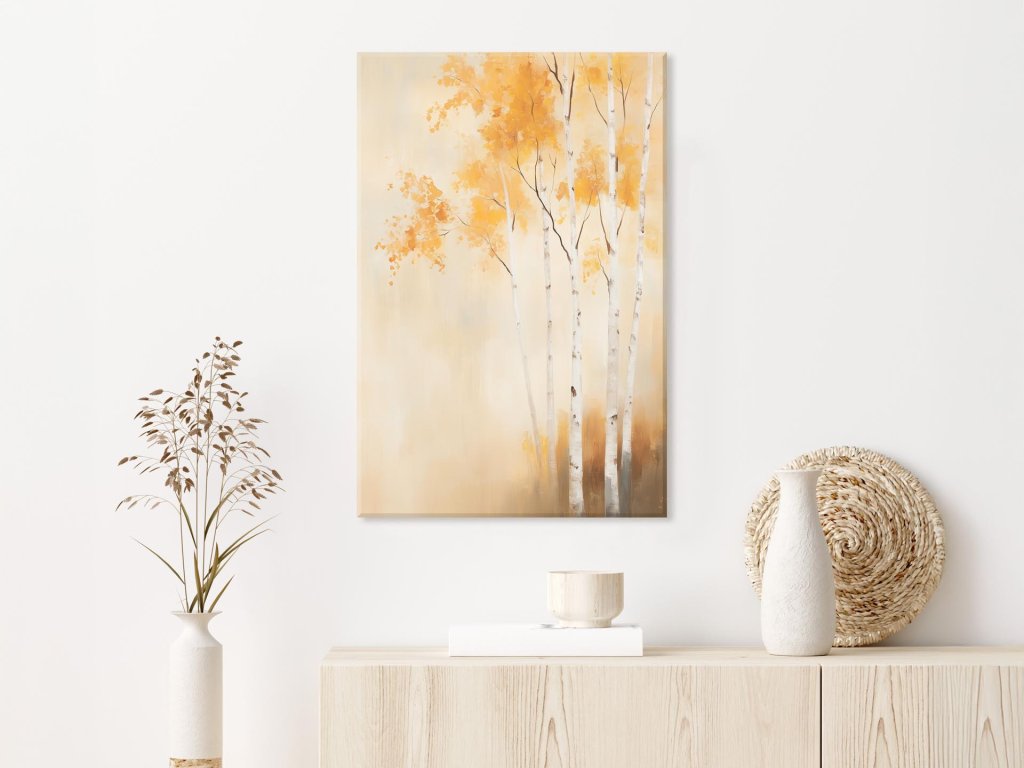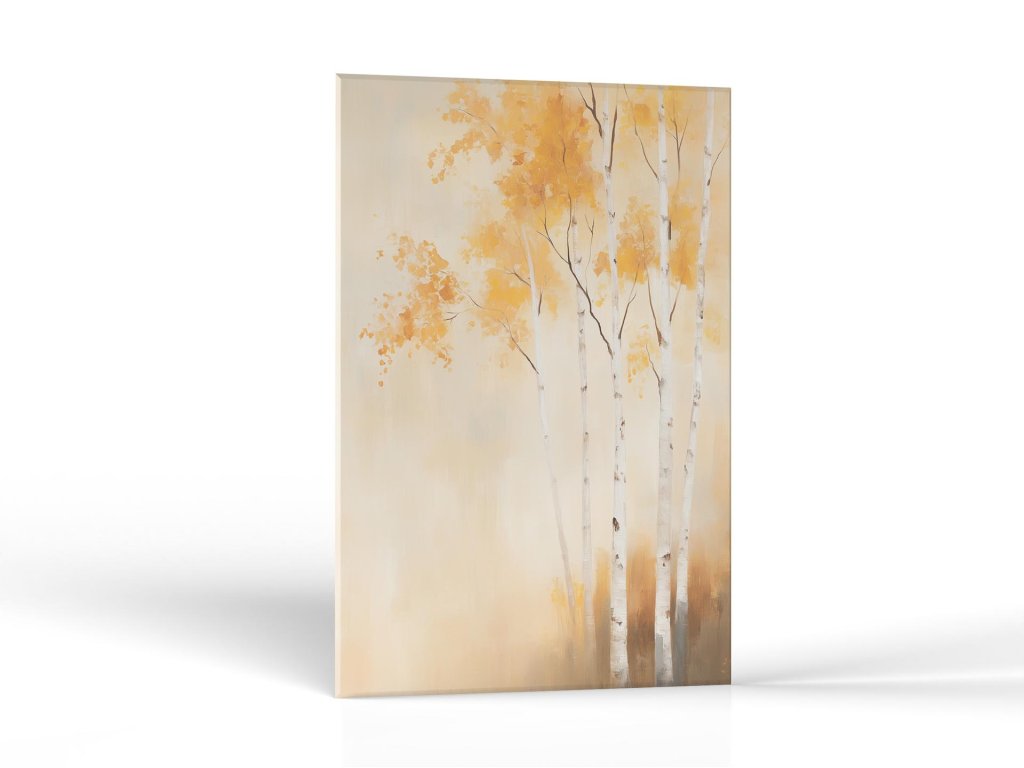 Tento obraz zachytáva štíhle kmene briez so svetlou kôrou, ktoré vystupujú z teplého a pokojného pozadia. Zlaté listy, namaľované vo voľnejšom štýle, evokujú jesenné ranné svetlo a vytvárajú pocit ticha a harmónie. Kompozícia pôsobí jemne a vyvážene, čím v divákovi navodzuje dojem spomaleného plynutia prírody.