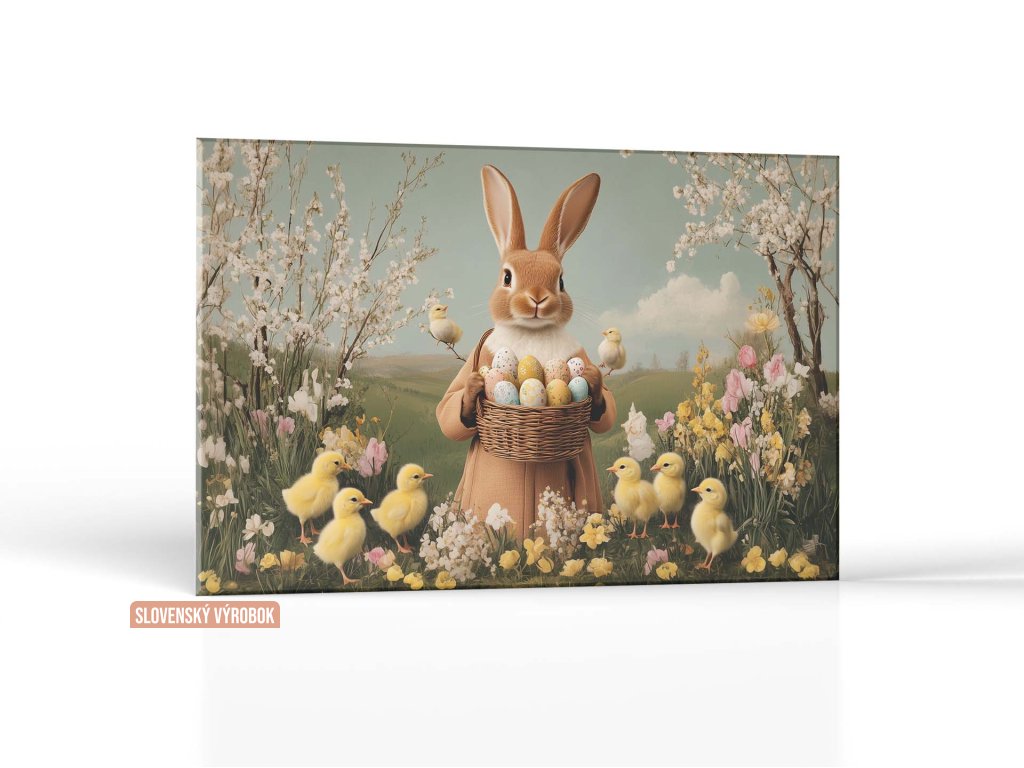 Tento obraz zachytáva očarujúcu veľkonočnú atmosféru s usmievavým zajačikom, ktorý s láskou nesie košík plný krásne ozdobených vajíčok. Okolo neho pobehujú malé žlté kuriatka a vo vzduchu poletujú vtáčiky, čím celý výjav pôsobí nežne a harmonicky. Jarné kvety a rozkvitnuté stromy v pozadí otvárajú scénu plnú pokoja, radosti a prísľubu nového začiatku.