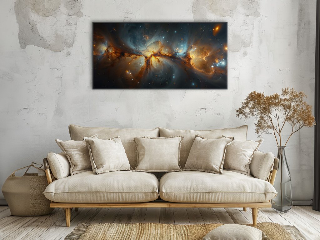 Tento obraz zobrazuje dramatickú kozmickú explóziu, kde svetelné výbuchy a farebné víry dominujú vesmíru. Jasné oranžové a modré farby sa miešajú s tmavými oblasťami, čím vytvárajú dynamickú a fascinujúcu scenériu. Detaily svetelných bodov a jemné prechody farieb umocňujú dojem hĺbky a nekonečnosti vesmíru, ktorý nás obklopuje.