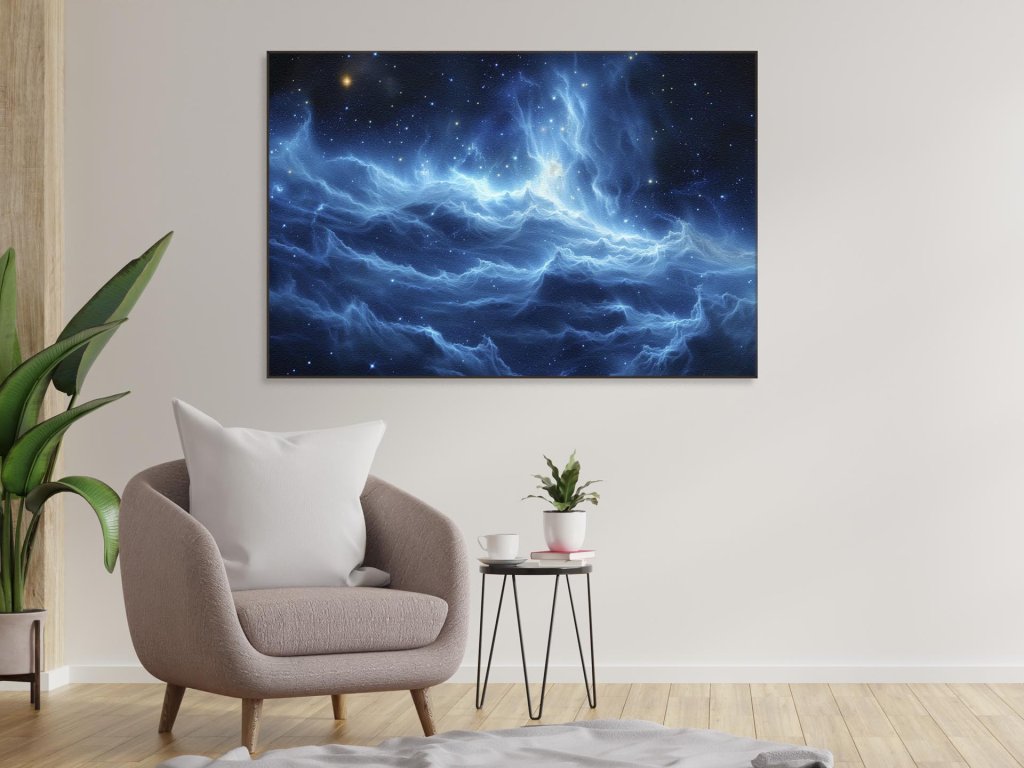 Na tomto obraze sa tiahne pôsobivý prúd modrej, luminiscenčnej hmloviny, ktorá sa vlní ako more vo vesmírnej expanzii. Svetielkujúce hviezdy pretínajú temnotu a vytvárajú kontrast s energickými vlnami hmloviny, zatiaľ čo jemnejšie trblietanie vzdialených galaxií dodáva scéne hĺbku a komplexnosť. Tento fascinujúci pohľad na kozmickú krásu evokuje pocit nekonečnej zvedavosti a objavovania.