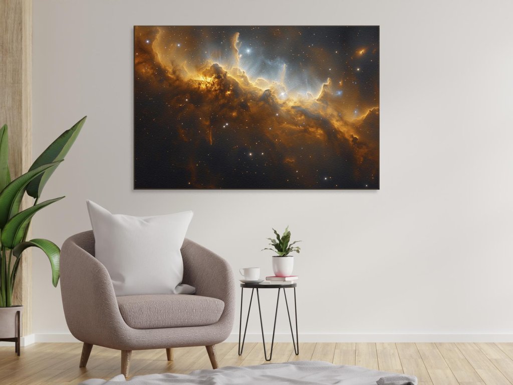 Obraz zachytáva úchvatnú scenériu vesmírneho hmloviny, s nádhernými zlatistými a oranžovými tónmi, ktoré vytvárajú dramatický kontrast so záhadnou tmou vesmíru. Hviezdne lúče a svetielkujúce hviezdy pridávajú obrazu hĺbku a žiarivosť. Tento vizuál preniká do tajov vesmírneho priestoru a umožňuje nám nahliadnuť do dynamického prostredia hviezdneho vzniku.