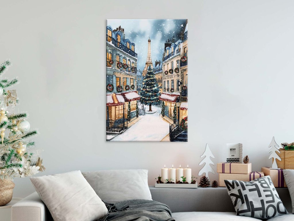 Tento obraz zobrazuje krásnu zimnú scénu v Paríži, kde ulicu pokrýva jemný sneh, a z okien svieti teplé svetlo. Uprostred námestia stojí ozdobený vianočný stromček, okolo ktorého sú budovy so sviatočnými vencami. Eiffelova veža sa týči v pozadí, čo dodáva obrazu magický parížsky vianočný nádych.
