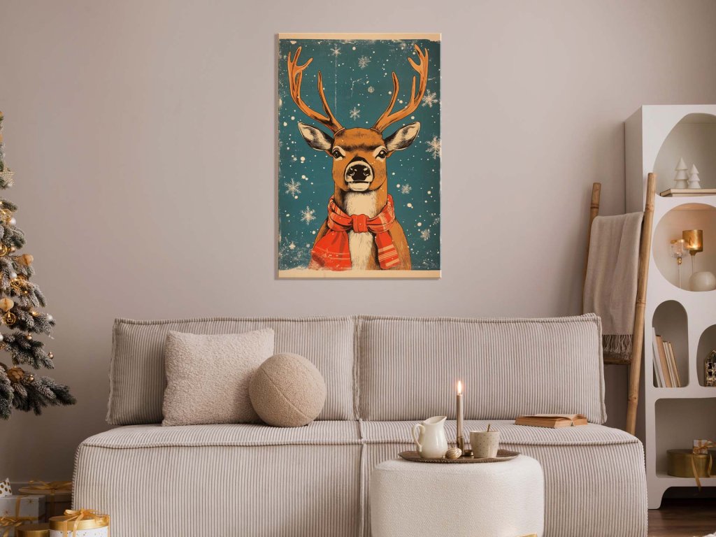 Na obraze vidíme majestátneho soba s výraznými parohami, ktorý má na krku červený šál. Okolo neho padajú snehové vločky, čím obraz vytvára zimnú, vianočnú atmosféru. Jemné detaily v jeho výraze a kontrast červeného šálu na modrom pozadí dodávajú scéne sviatočný nádych.