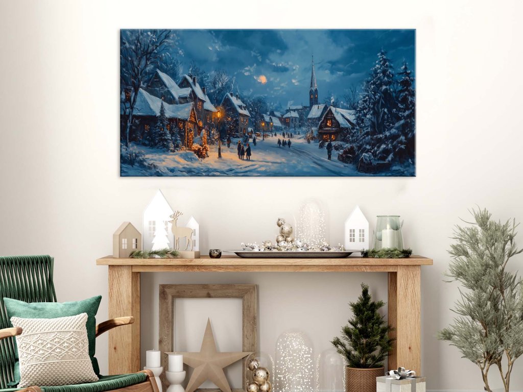 Obraz zachytáva pokojnú zimnú dedinu, kde domy a ulice sú pokryté hrubou vrstvou snehu. Lampy pozdĺž cesty osvetľujú zasneženú krajinu, pričom svetlo z domov vytvára teplú atmosféru. V diaľke sa týči kostolná veža, ktorá dodáva scéne majestátnosť, zatiaľ čo dedinčania sa prechádzajú a užívajú si ticho a kúzlo zimnej noci.