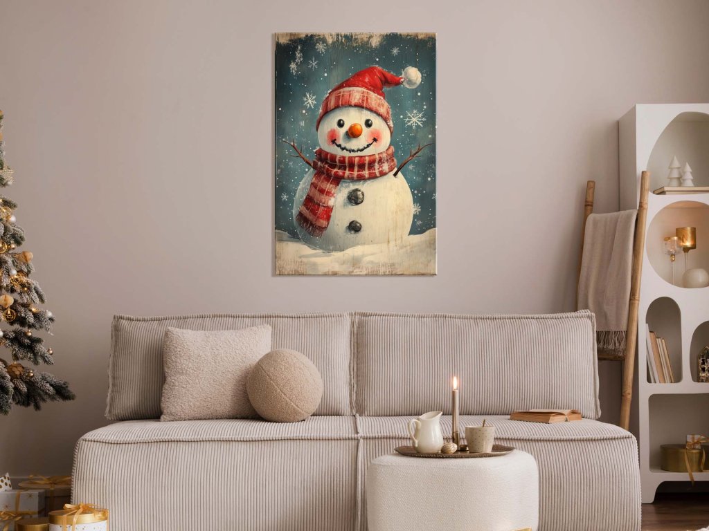 Na obraze je usmiaty snehuliak s oranžovým mrkvovým nosom, oblečený v červenej čiapke a šále s bielymi prúžkami. Jeho oči a gombíky sú z uhlíkov a ruky tvoria jednoduché vetvičky. Pozadie zdobia padajúce snehové vločky a snehuliak vyžaruje radostnú zimnú atmosféru.