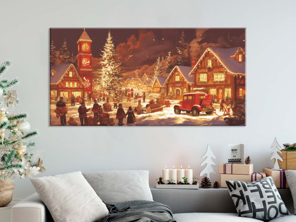 Obraz zachytáva idylickú vianočnú dedinu, ktorá je ozdobená vianočnými svetlami, venčekmi a veľkým vianočným stromčekom v strede. Ľudia sú oblečení v teplých zimných oblekoch, užívajú si sviatočnú atmosféru, zdobia stromček, pripravujú darčeky a trávia čas spolu. Na scéne je staromódne červené auto, ktoré prináša darčeky, a celá dedina je pokrytá jemným snehom, čo umocňuje atmosféru pokoja a radosti.