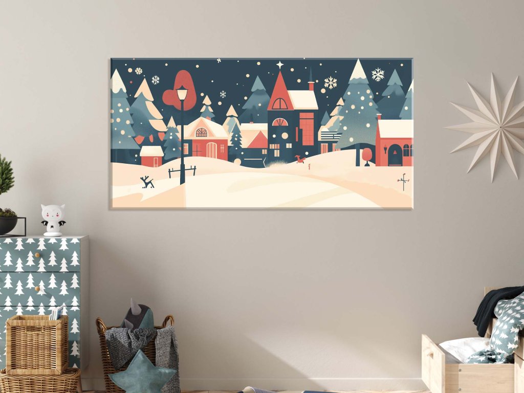 Obraz zobrazuje malebnú zimnú dedinu s farebnými domčekmi a vysokými ihličnatými stromami, všetko pokryté bielou prikrývkou snehu. Nočná obloha je posiata snehovými vločkami, ktoré ticho padajú na pokojné okolie. Tento obrázok vyžaruje atmosféru pokoja, vianočnej radosti a zimného pokoja v zasneženej krajine.