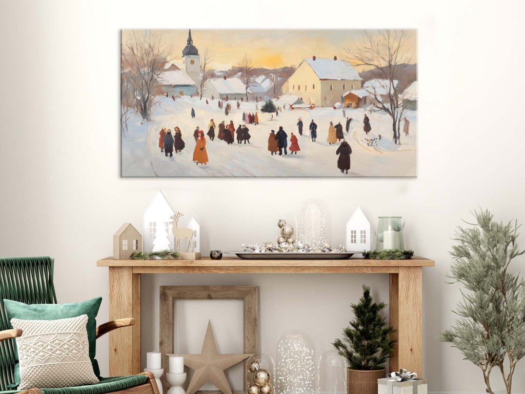 Na obraze vidíme typickú dedinskú scénu zasneženej zimy, kde sa obyvatelia v tradičných odevoch prechádzajú po uliciach. V pozadí dominuje kostol s vežou, zatiaľ čo domy a stromy pokrýva sneh. Atmosféra vyžaruje pokoj a prípravu na sviatočné obdobie, pričom sa na námestí vyníma ozdobený vianočný stromček.