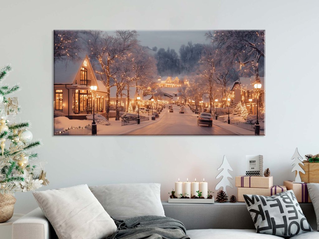 Obraz zobrazuje zasneženú ulicu, kde svetielka vianočných dekorácií osvetľujú domy a stromy. V pozadí vidno rozsvietené budovy, čo pridáva teplo do inak chladného zimného večera. Autá ticho prechádzajú zasneženou cestou, vytvárajúc dojem pokoja a blížiacej sa sviatočnej pohody.