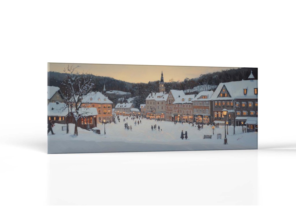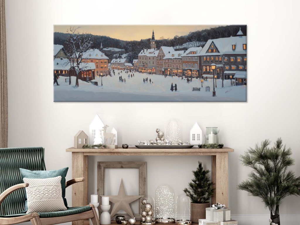 Obraz zachytáva zimné mestské námestie, kde sa stretávajú obyvatelia pod osvetlenými domami a lampami, ktoré vytvárajú teplú atmosféru uprostred zimy. Budovy sú zdobené sviatočnými dekoráciami, ktoré zdôrazňujú blížiacu sa sviatočnú sezónu. Scénu obklopujú zasnežené kopce, ktoré dotvárajú idylický výjav a umocňujú pokoj a radosť zo zimného obdobia.