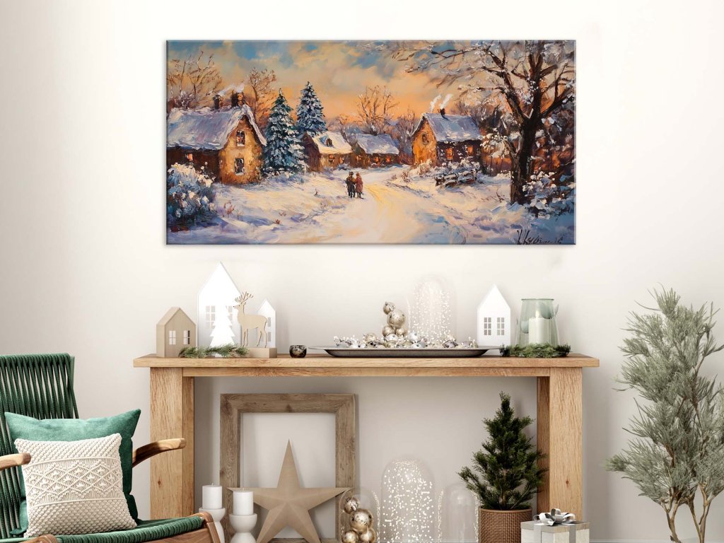 Obraz zachytáva idylický zimný podvečer v malej zasneženej dedine, kde svetlo z domov osvetľuje okolité stromy a snehom pokryté strechy. Dva zasnežené smreky stoja v popredí, zatiaľ čo dvaja ľudia prechádzajú kľudnou cestou. Západ slnka pridáva teplé odtiene, ktoré kontrastujú s chladným zimným prostredím a dodávajú obrazu pocit harmónie a pokoja.