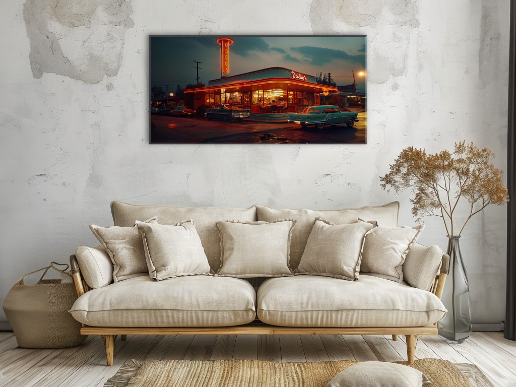 Obraz zachytáva ikonické nočné bistro s jasnými neónovými svetlami, ktoré osvetľujú okolité prostredie. Pred bistrom sú zaparkované staré vintage automobily, ktoré dodávajú scéne autentický retro nádych. Vo vnútri bistra môžeme vidieť hostí sediacich pri stoloch, ktorí si vychutnávajú večernú atmosféru tohto historického miesta.