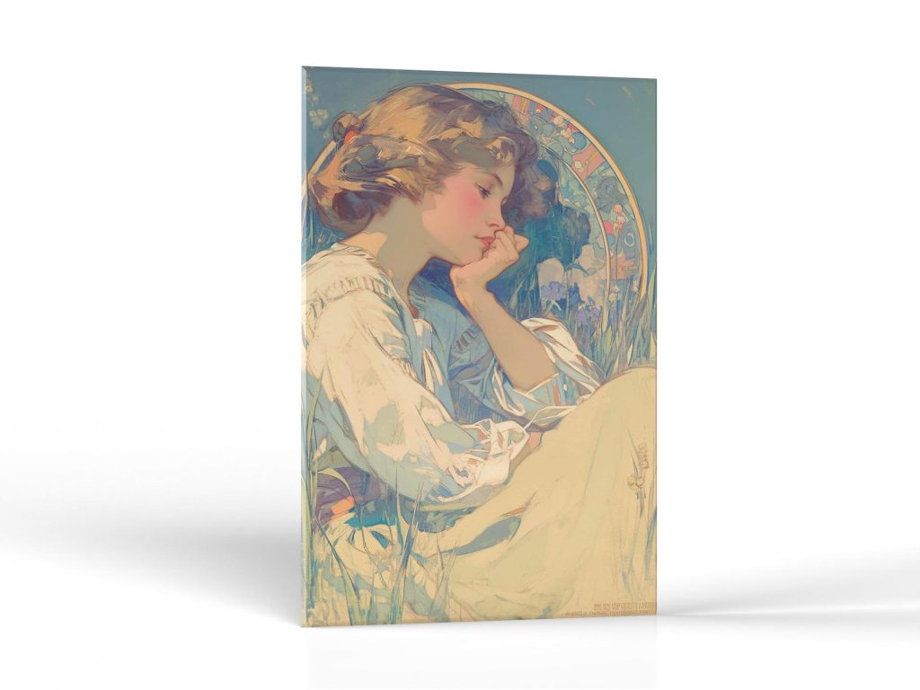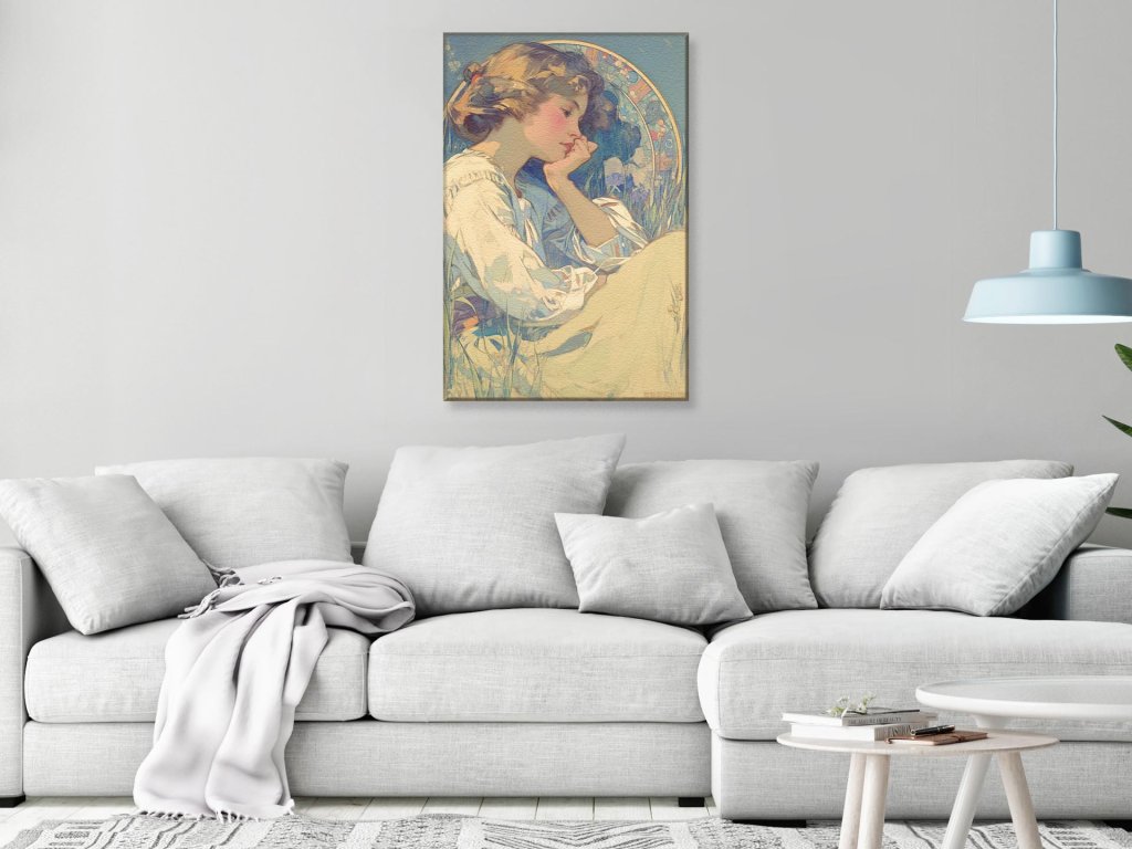 Na obrázku je mladá žena s ružovými lícami a zatvorenými očami, ktorá odpočíva v prírode a zahľadene sa dotýka brady rukou. Jej šat a okolie sú plné pastelových farieb a florálnych motívov, čo dodáva kompozícii pokojnú a romantickú atmosféru. V pozadí je vidieť abstraktný florálny vzor, ktorý spolu s celkovým štýlom a farbami pripomína obdobie Art Nouveau.
