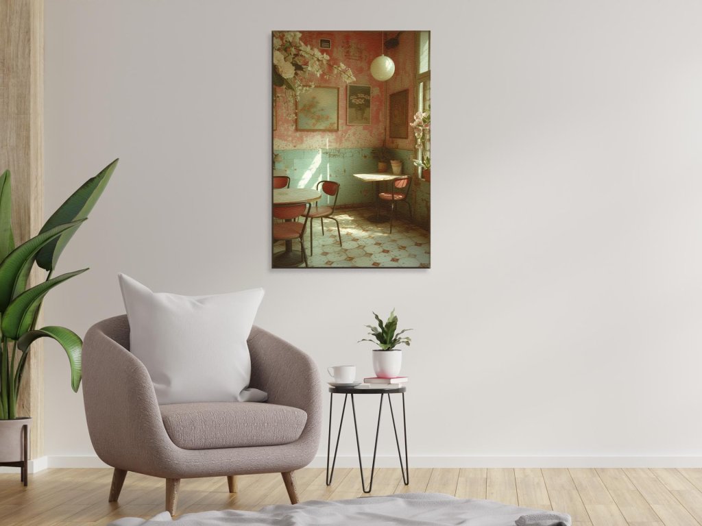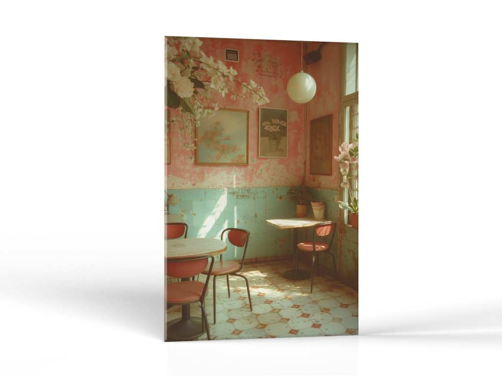 Kaviareň má nádych starého sveta s opotrebovanými ružovými stenami a tyrkysovými dlaždicami. Steny sú zdobené obrazmi kvetín a miestnosť oživuje množstvo živých rastlín. Priestor je osvetlený jemným prirodzeným svetlom prechádzajúcim cez okno, čo vytvára útulnú atmosféru.