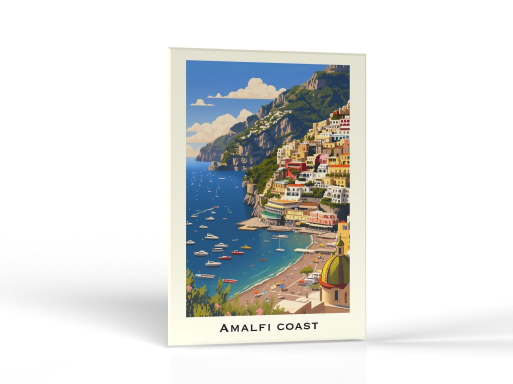Farebné pobrežné mesto Amalfi rozprestierajúce sa pozdĺž skalnatého útesu.
