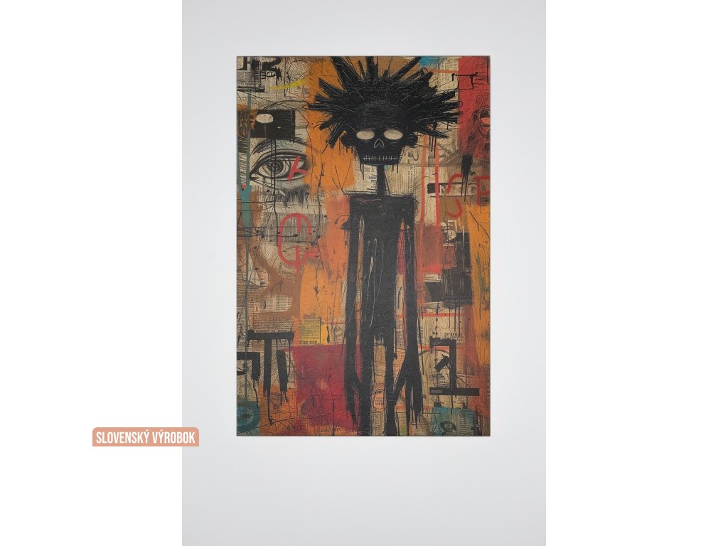 Obraz predstavuje abstraktnú postavu s lebkou a výrazným vizuálnym štýlom.